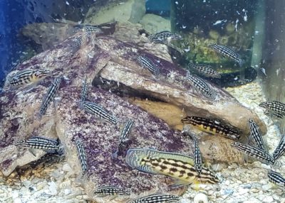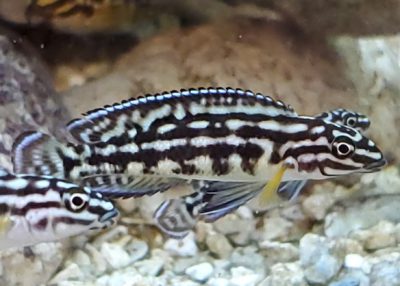 The Julidochromis Marlieri is a fantastic Lake Tanganyika Cichlid. This fish is found in the wild in rocky habitats and prefers an environment with piles of rocks arranged to form caves filling much of the aquarium. Julidochromis are cave spawners and form pair bonds that generally last a lifetime.